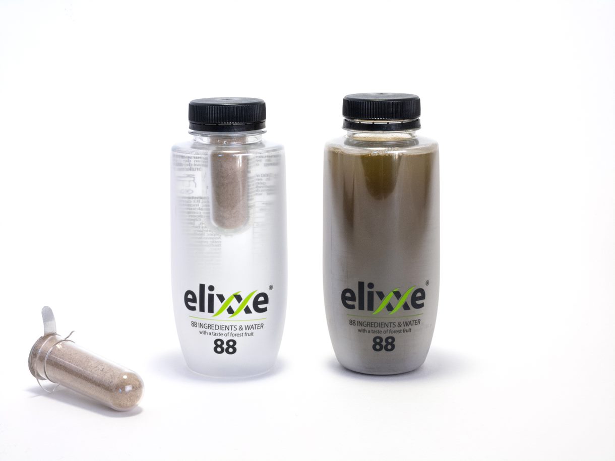 Om de Elixxe drank naar de markt te kunnen brengen hebben we alles vanaf eerste verpakkingsconcepten tot en met de eerste serieproductie in handen genomen. Met de combinatie van een uniek flesontwerp met een ingrediënten capsule, wordt de Elixxe drank onderscheidend gepositioneerd in het winkelschap. Naast de premium drankfles biedt Elixxe ook online te bestellen navulverpakkingen aan. We hebben in het ontwerp slim gebruik gemaakt van een standaard capsule en dop waarmee in korte tijd de verpakking klaargemaakt is voor eerste pilots en verkoop in de markt.